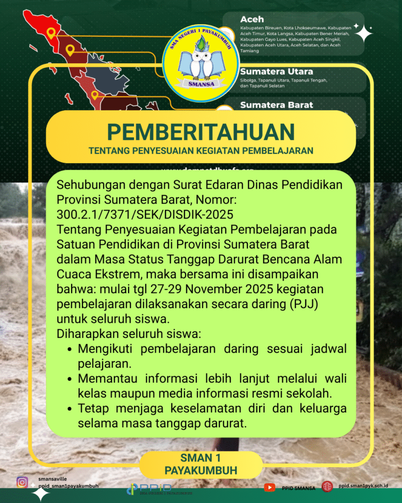 November 29, 2025SMAN 1 Payakumbuh menyampaikan informasi resmi terkait penyesuaian kegiatan pembelajaran berdasarkan Surat Edaran Dinas Pendidikan Provinsi Sumatera Barat Nomor 300.2.1/7371/SEK/DISDIK-2025 tentang Penyesuaian Kegiatan Pembelajaran Pada Satuan Pendidikan di Provinsi Sumatera Barat Dalam Masa Status Tanggap Darurat Bencana Alam Cuaca Ekstrem.